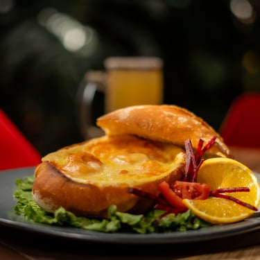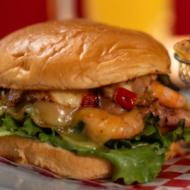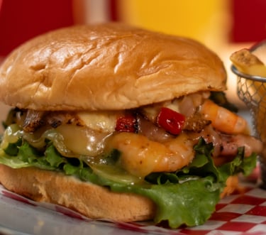 hamburguesa hecha con camarones salteados y gratinados con chile morrón y tocino, acompañados de papas a la francesa.