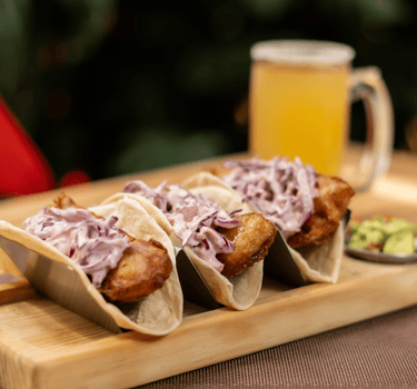 3 tacos de pescado rosado en tempura acompañados de una ensalada de col morada con mayonesa.