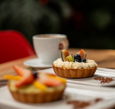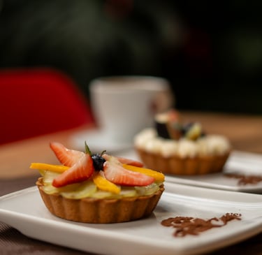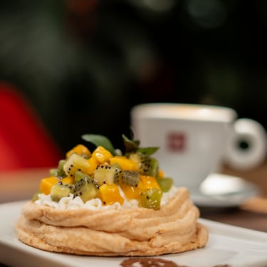 Tersa base de merengue con relleno de maracuyá y crema montada, acompañada de mango y kiwi.