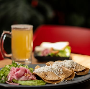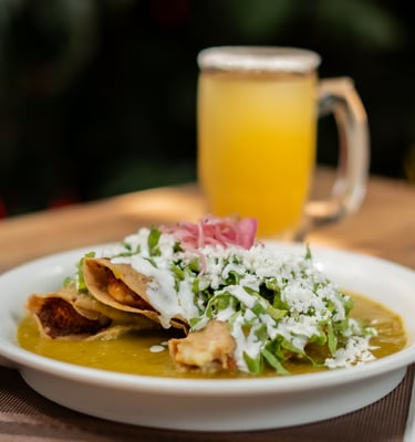 Trío de quesadillas fritas rellenas de papa con queso, bañadas en nuestra tradicional salsa verde con crema, queso y lechuga.