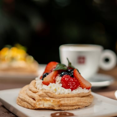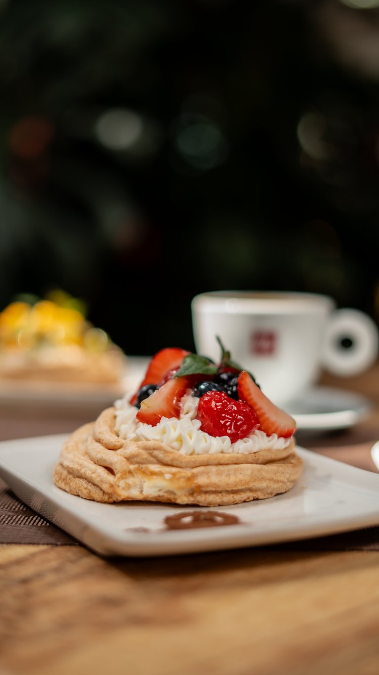 Tersa base de merengue, rellena de crema montada con frutos rojos.