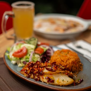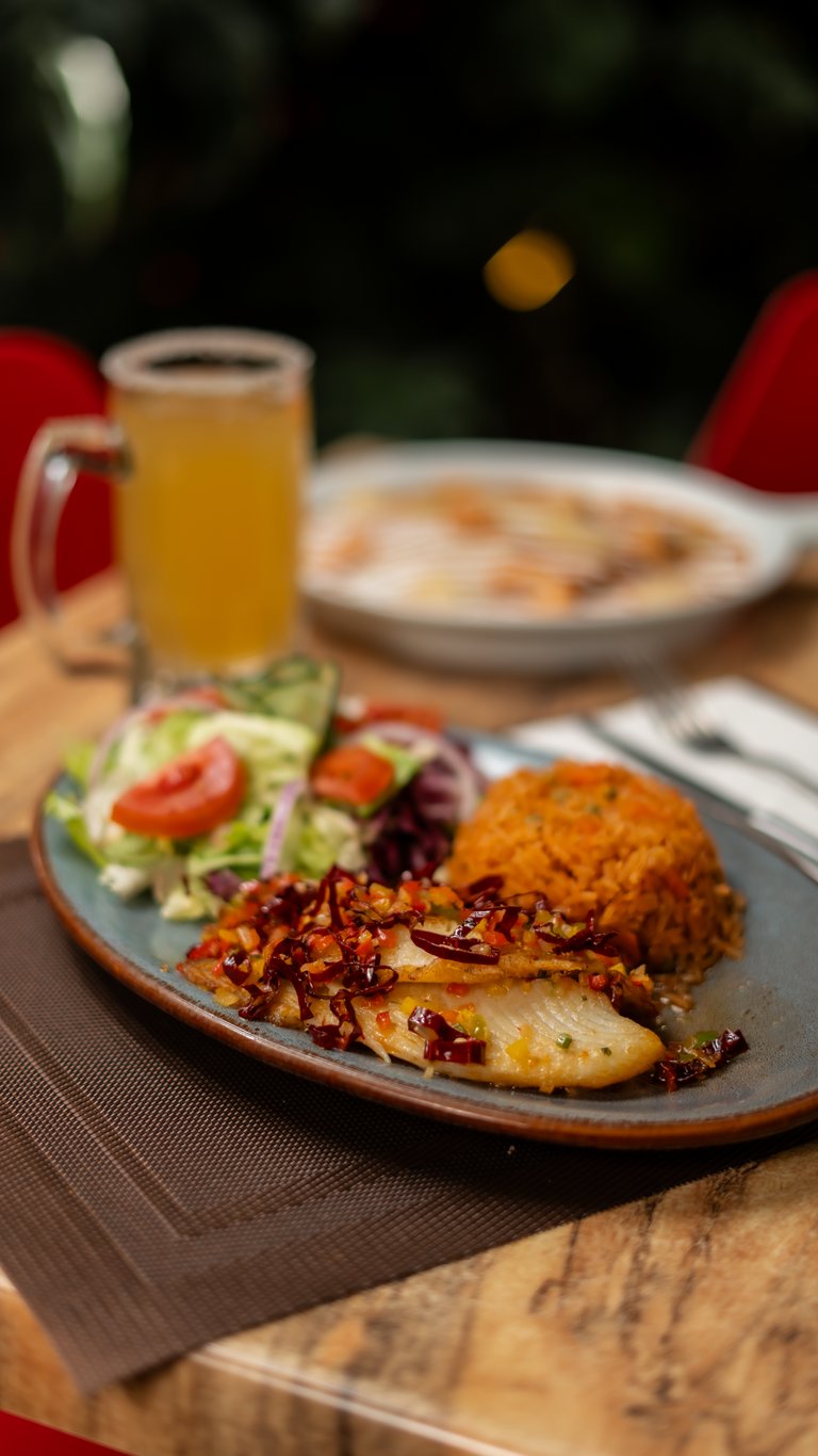 Asado la plancha, bañado en nuestra receta especial de mojo de ajo, acompañado de ensalada mixta y arroz rojo