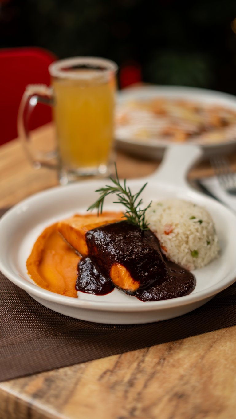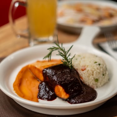 Salmón a la plancha sobre un terso puré de camote dulce, bañado con una salsa de Jamaica y acompañado de arroz blanco.