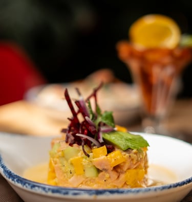 Salmón fresco curtido en leche de tigre con toque de maracuyá, acompañado de mango y pepino.
