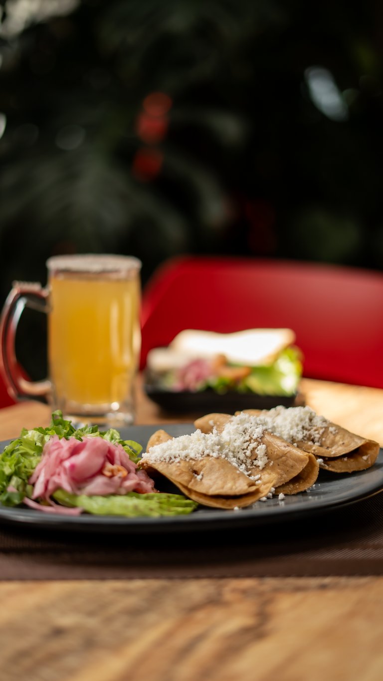 Tres piezas, rellenos de camarón sofrito con tocino y cebolla, con tortilla de harina, acompañados de aguacate, queso Oaxaca y cebolla morada.