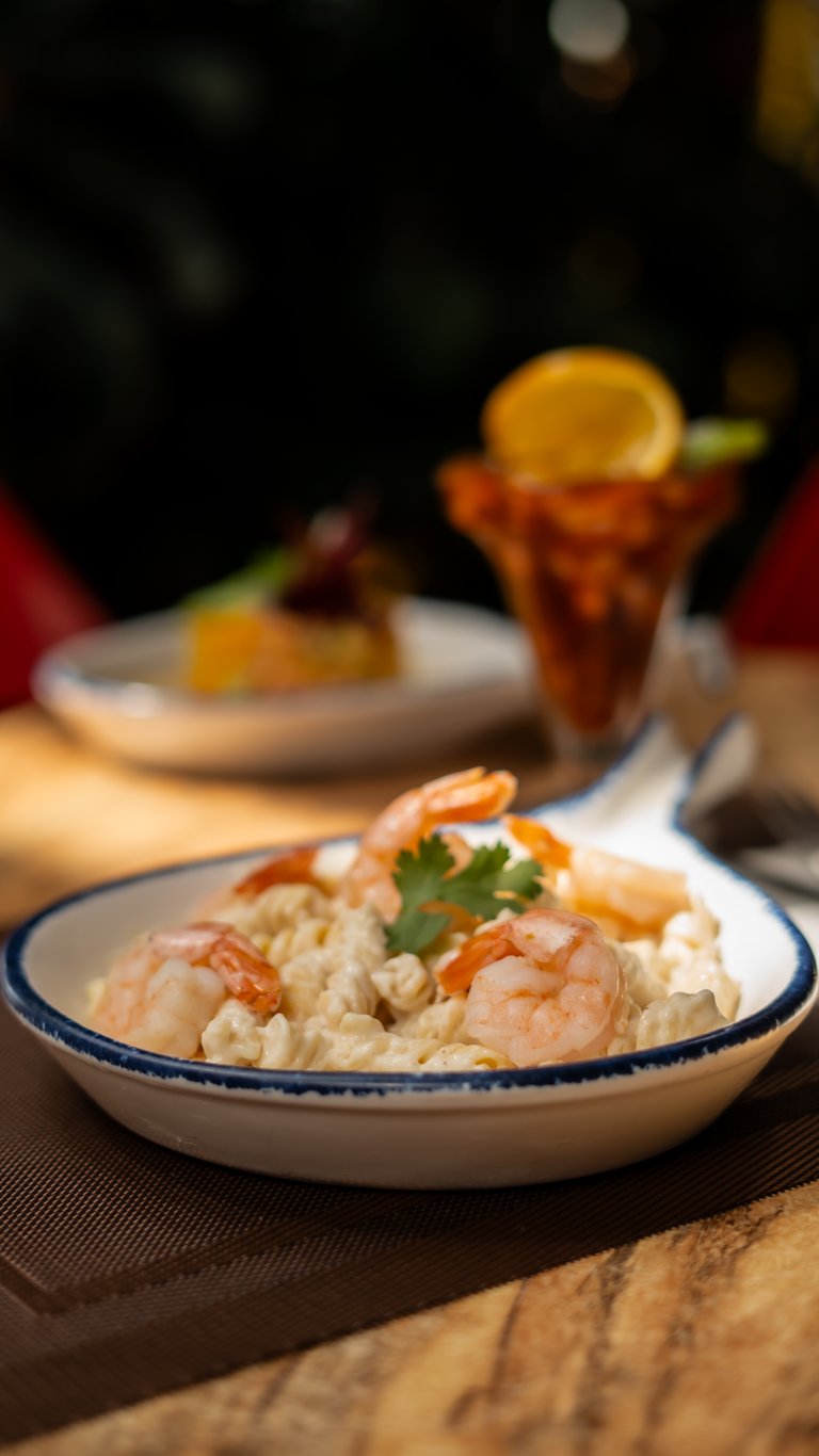 Fusilli a los 4 quesos con camarones.