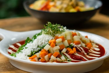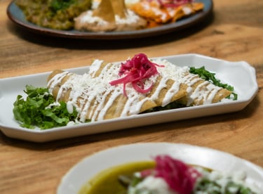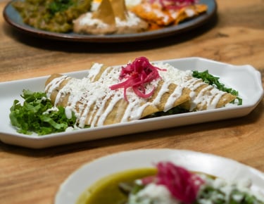 3 enchiladas rellenas de requesón, bañadas en salsa de guajillo, acompañadas de papa con zanahoria y crema con queso.