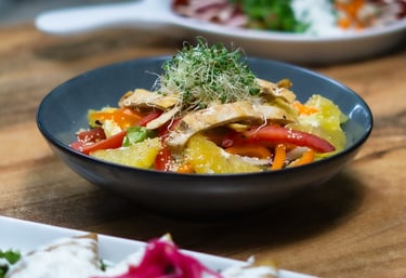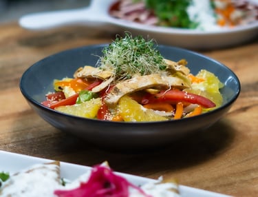 Mezcla fresca de lechugas, adicionada con arándanos, queso de cabra, amaranto, jitomate, aderezo, miel-mostaza y supremas de naranja.