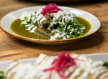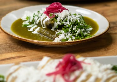 2 piezas de tlacoyos rellenos de requesón, bañados en salsa de tomate verde con crema y queso.
