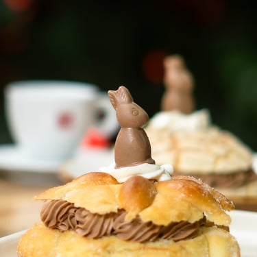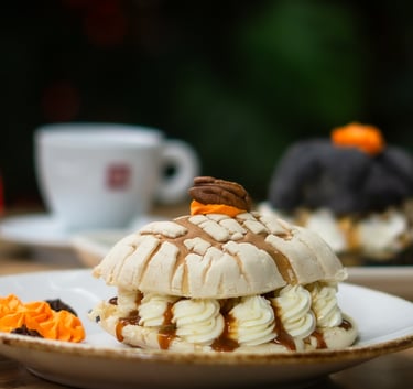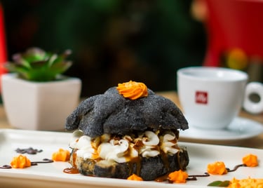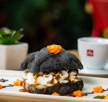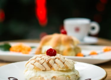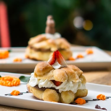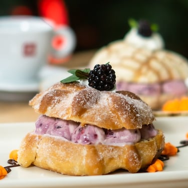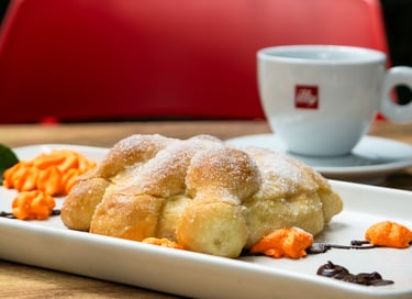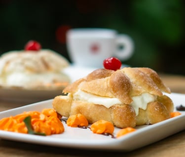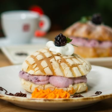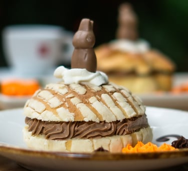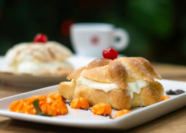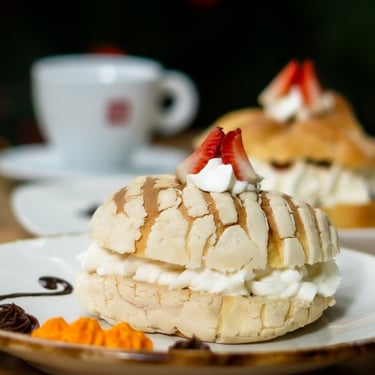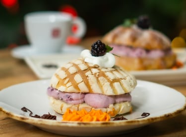 Pan de muerto o concha rellena de crema de mantequilla y toque de cajeta.