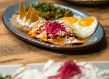 2 huevos estrellados, acompañados de chicharrón en salsa verde, chilaquiles rojos y frijoles refritos.