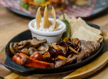 Arrachera bañada en ajillo, acompañada de frijoles, chistorra (40 gr.), dos quesadillas y champiñones.