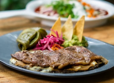 Huarache tradicional, acompañado de costilla norteña, queso oaxaca, guacamole y frijoles.
