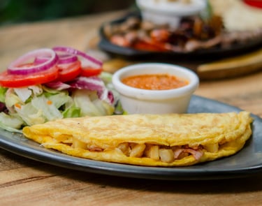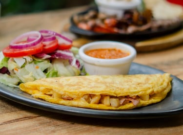 Omelette relleno de jamón, queso y piña, acompañado de ensalada y salsa pomodoro.