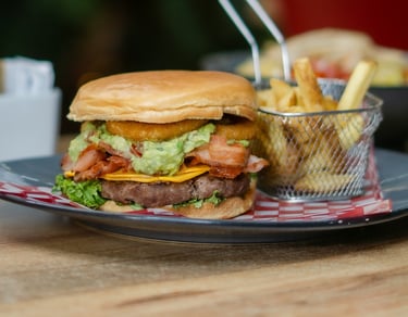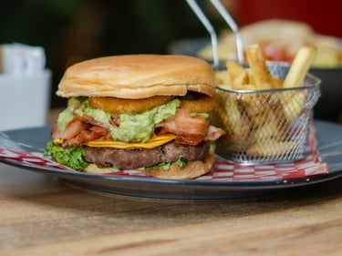 Hamburguesa con jugosa carne de res, acompañada de tocino, aros de cebolla y guacamole, agregando el sabor del queso amarillo.