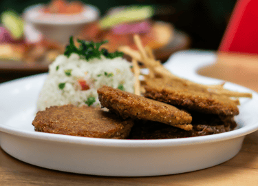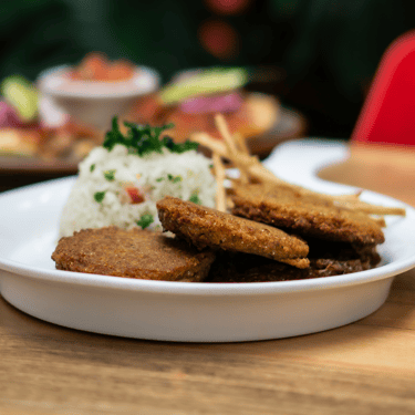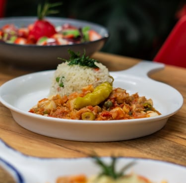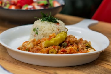Tradicional y exquisito bacalao con un toque de la casa, acompañado de arroz blanco.
