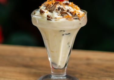 Manzana preparada en una crema dulce, adicionada de nuez y pasas.