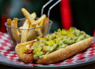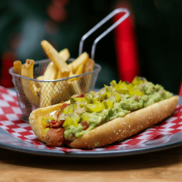 Hocho especial en un tamaño extra, con chorizo, guacamole y pepinillos.