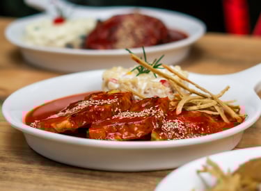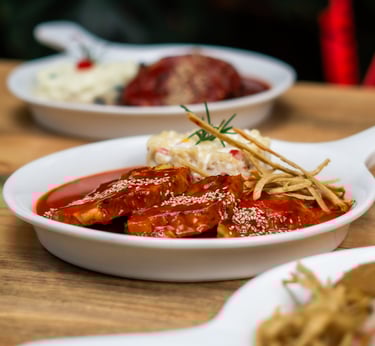 Base de frijoles y salsa Xico que lleva un toque de picante con chocolate, acompañados de una costilla, huevo estrellado y aguacate.