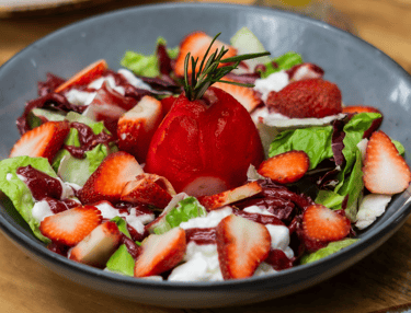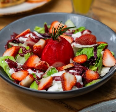 Base de lechuga y espinacas, fresas y queso cotagge, culi de frutos rojos y una pera reposada en vino.