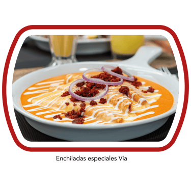 Bañadas en nuestra salsa roja cremosa, rellenas de pollo, gratinadas con crema, un toque de chorizo frito y aros de cebolla.