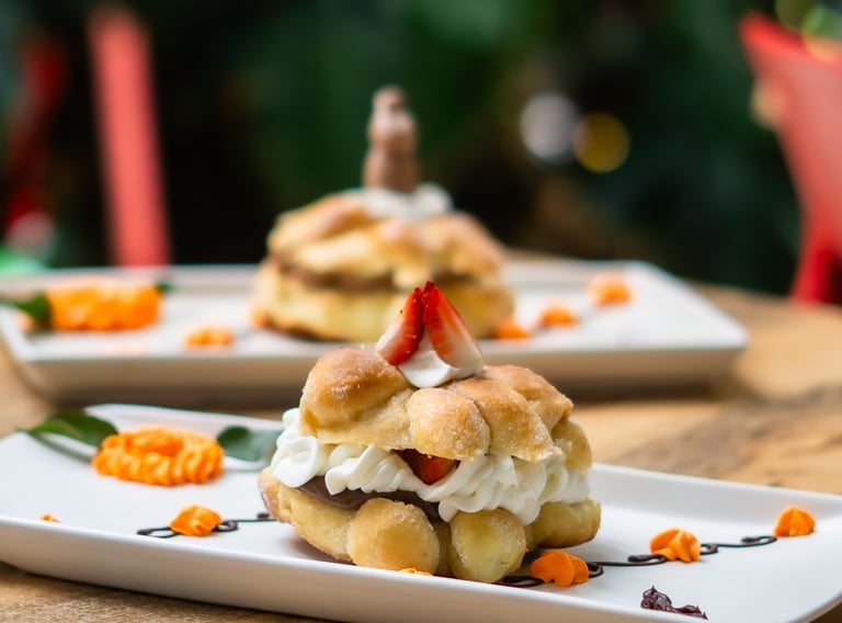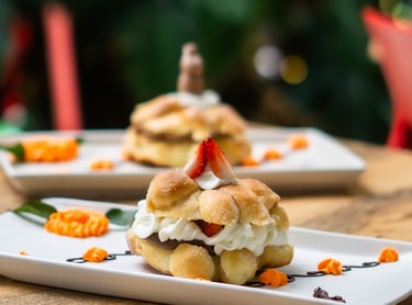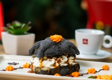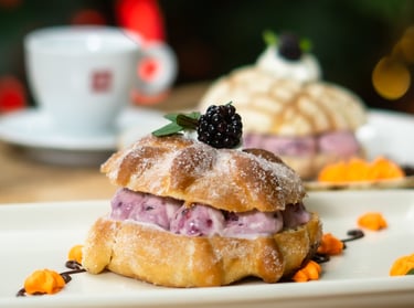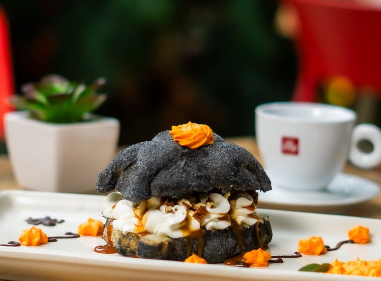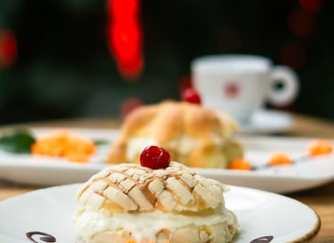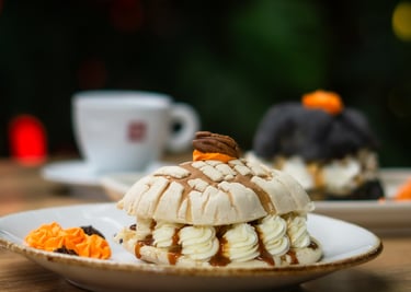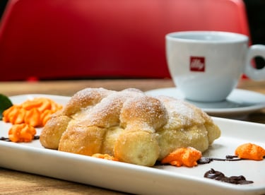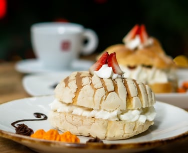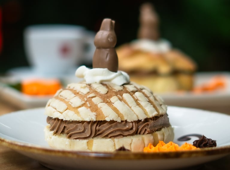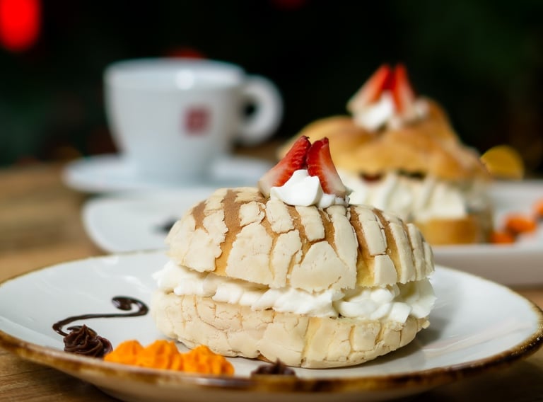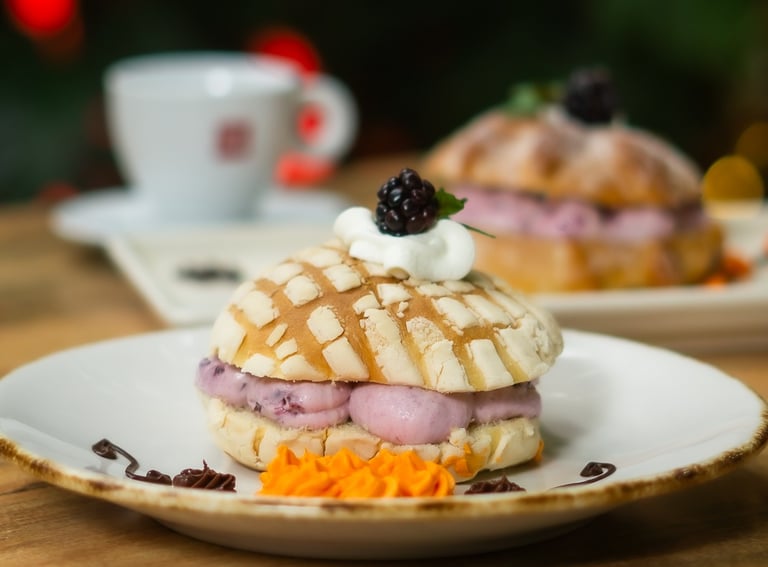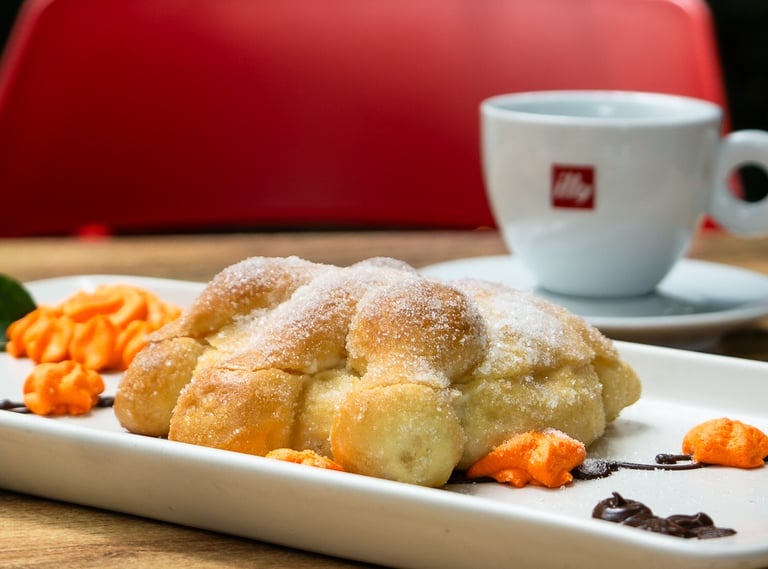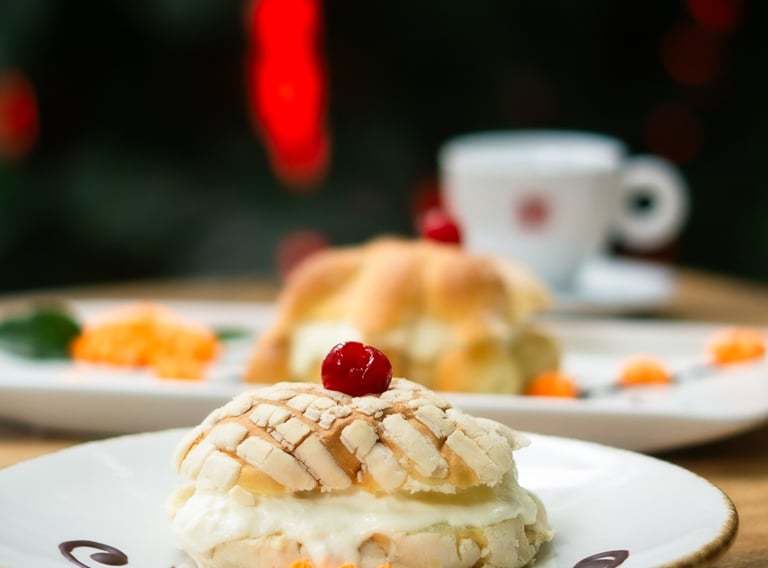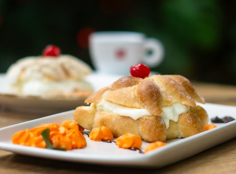 Pan de muerto o concha rellena de crema de mantequilla y toque de cajeta.