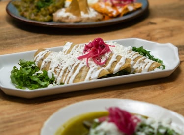 3 enchiladas rellenas de requesón, bañadas en salsa de guajillo, acompañadas de papa con zanahoria y crema con queso.