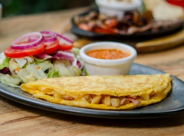 Omelette relleno de jamón, queso y piña, acompañado de ensalada y salsa pomodoro.
